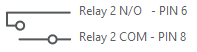 Pin 6 is Normally Open. When Relay 2 is activated, the relay is closed and allows voltage to pass through. Pin 8 is the common leg of the relay.