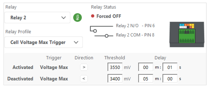 Once the switch (pin 6) is closed (activated), the battery powers the electric hot water tank until the battery cell voltage drops below 3.4 V for 5 minutes. In this system, the gas hot water tank is the main source of hot water, and the electric hot water tank is for preheating the water for use in the gas hot water tank.