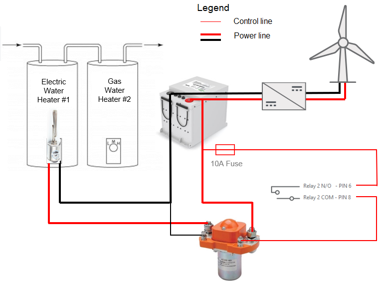 A wind turbine is used to generate power and charge the battery. To prevent the battery from overcharging, a relay is set up to activate when the battery cell voltage is nearing its maximum level and uses power in the battery to heat water in an electric hot water tank.