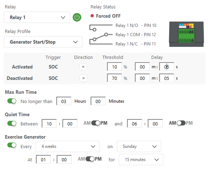 When the battery SOC drops below 10%, after a 5-second delay, pin 10 is closed (activated) and starts the generator to recharge the batteries. Once the battery SOC is greater than 70%, after a 5-second pause, pin 10 is opened (deactivated), and the generator is turned off.